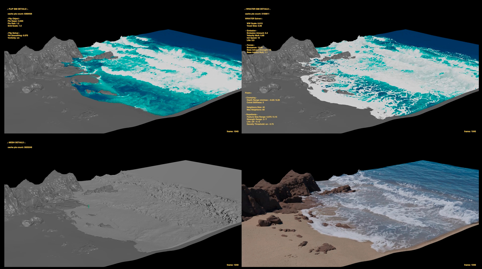 Challenges One of the main challenges was balancing multiple simulations with detailed interaction while maintaining scene stability and visual coherence. Achieving believable water behavior against static geometry, integrating groom dynamics naturally with environmental forces, and ensuring consistency across multiple shots required extensive iteration and technical refinement. This project strengthened my understanding of simulation layering, optimization strategies and the role of lighting in grounding complex FX work within a believable environment.